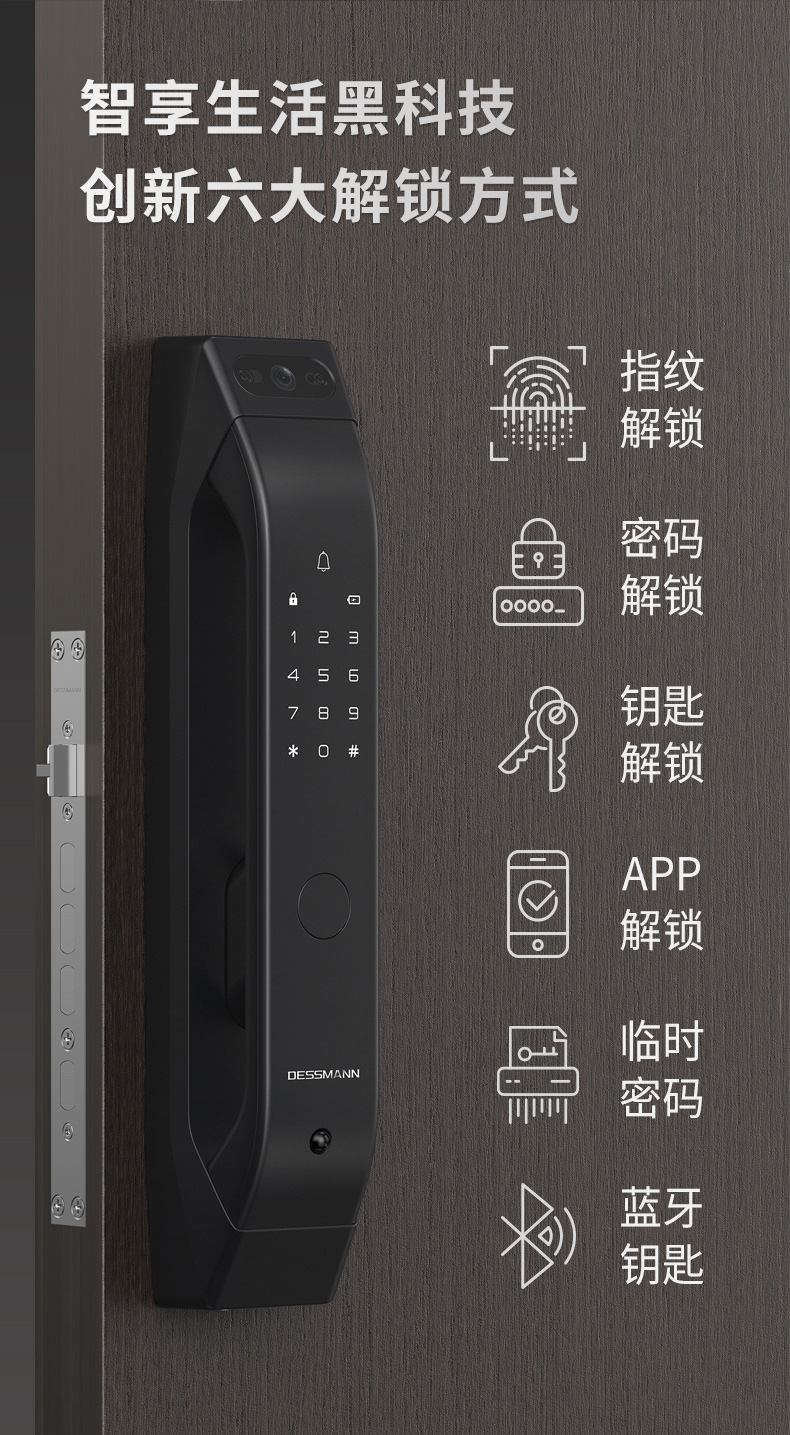 德施曼(DESSMANN)全自動智能鎖指紋鎖密碼鎖防盜門鎖 電子鎖智能門鎖門禁鎖 貓眼 免費安裝(Q5M)高端黑